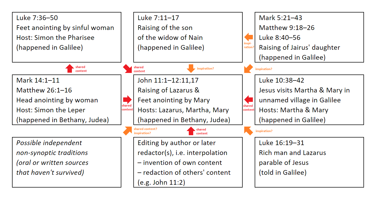 3年前の記事でWikipediaのLazarus of Bethany に触れている(当時と比較すると細かな修正がたくさんある)。マタイ伝26章、マルコ伝14章の「ベタニアで香油を注がれる」の話しと、ルカ伝10章の「マルタとマリア」の話などを組み合わせて編集した記事ではないかという説に触れている。共観福音書にはラザロの生き返りの記事はない。もし、この記述の通りの事があったなら、共観福音書で触れられないわけがないだろうから、恐らく事実はなかっただろう。読み返すと、3年前もそう考えていたのが思い出される。